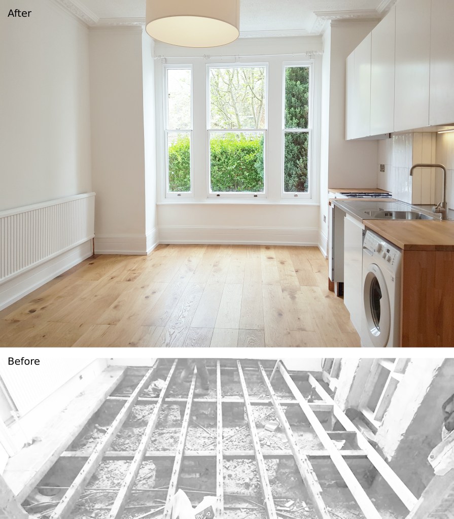 - Ground floor reconfigured as an open studio looking out bay windows, part of which can be screened off with pocket sliding doors to form a private study